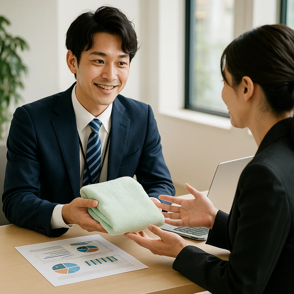 といった特性を持ち、販売先のお客様や贈答先に高い満足度を提供できます。営業現場では、タオルの性能を実演しながらご説明できるため、導入効果をより体感的に理解いただけます。