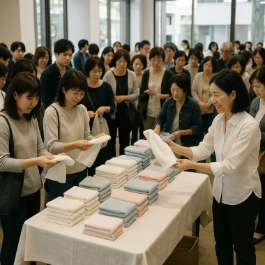 浅野撚糸では、法人様・団体様向けに 出張販売サービス を行っています。「エアーかおる」をはじめとする人気シリーズを、企業や施設、イベント会場まで直接お持ちし、その場で商品を販売。お客様に実際に見て・触
